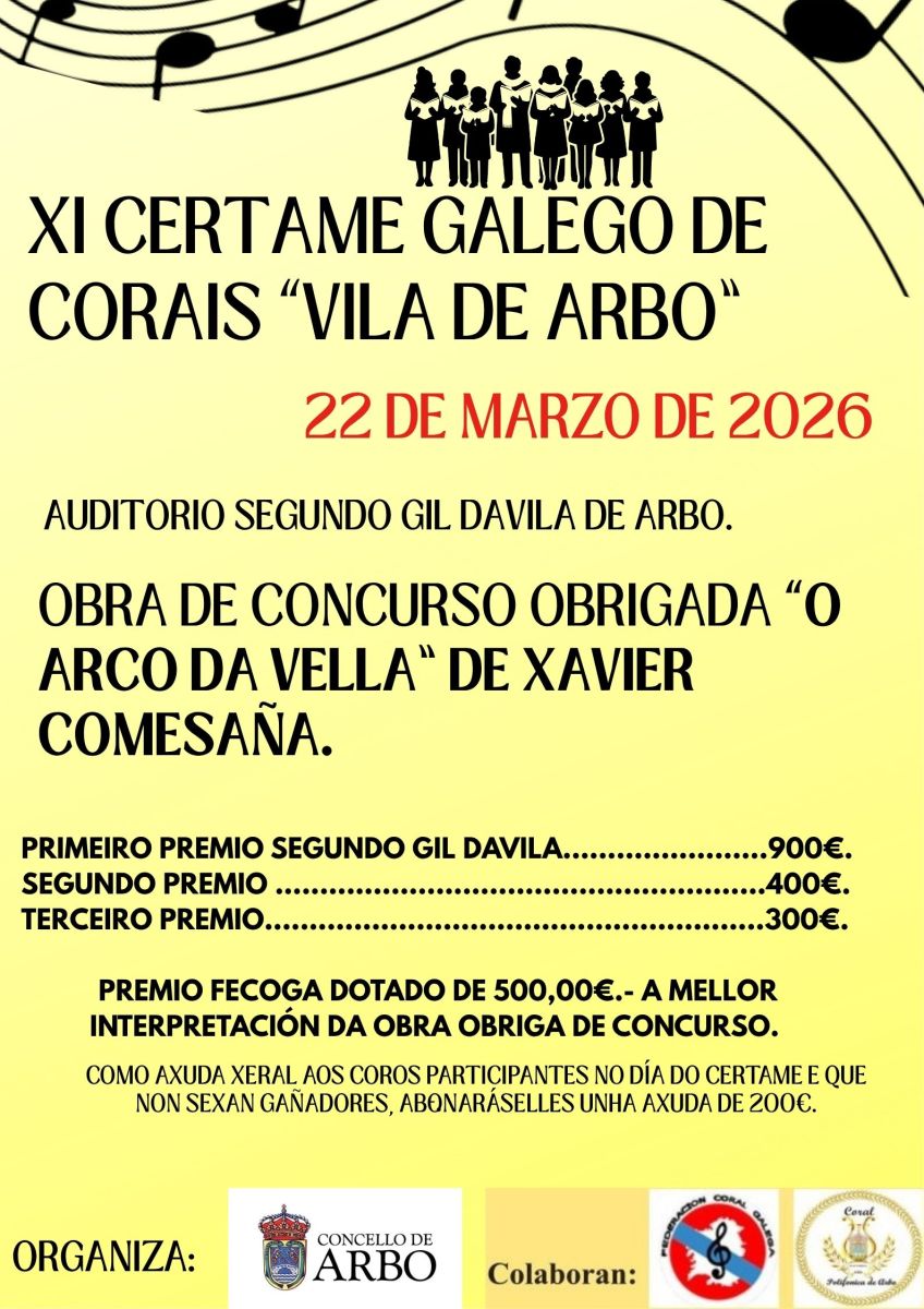 O Certame de Corais Vila de Arbo é un evento anual que busca apoiar e fomentar a cultura musical polifónica. Este certame consolidouse como un referente para os amantes da música coral, ofrecendo unha plataforma para que coros de diversas localidades poidan mostrar o seu talento e compartir a súa paixón pola música. O obxectivo principal do Certame de Corais Vila de Arbo é incentivar a modalidade polifónica, un estilo musical que des ...